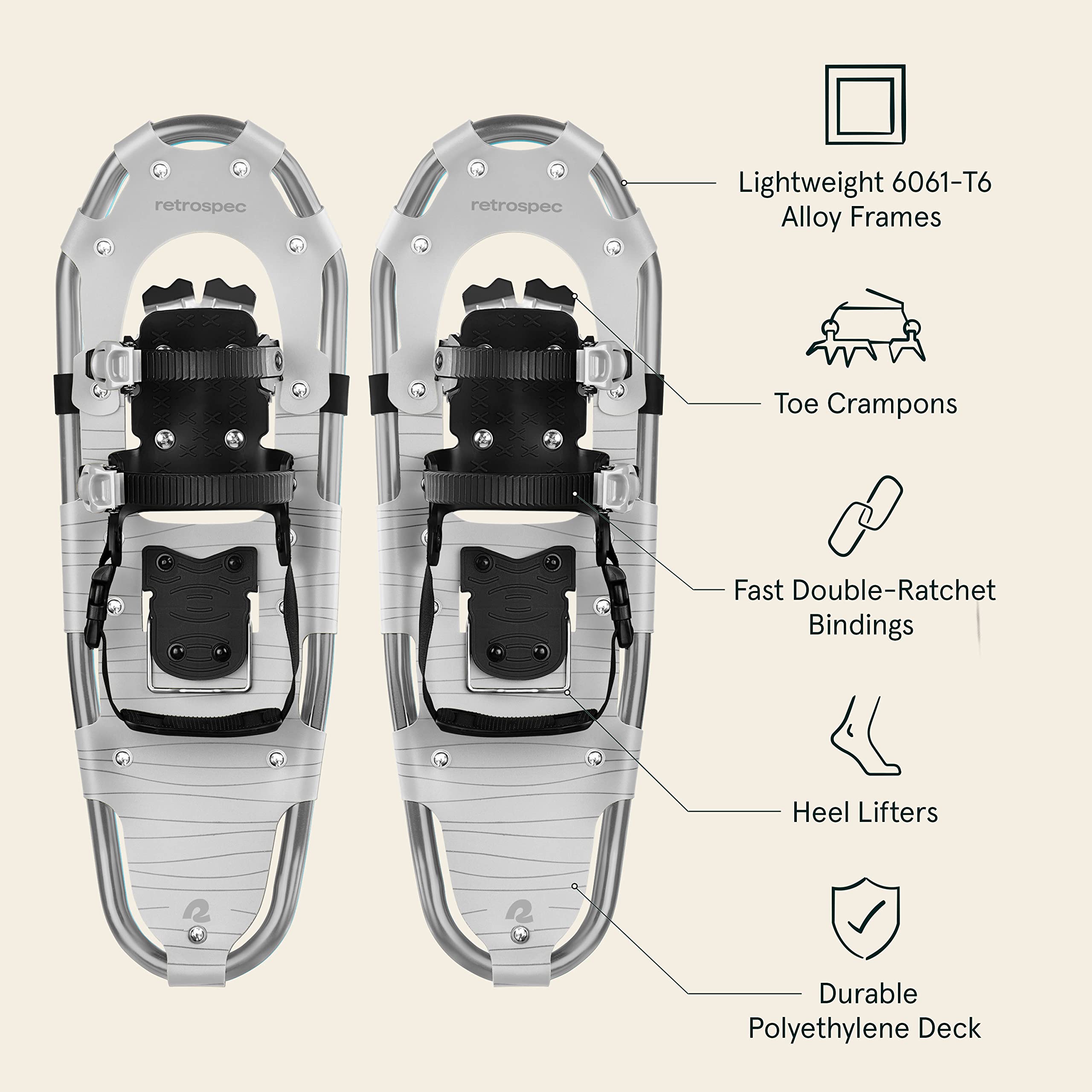 - LIGHTWEIGHT DURABILITY: Lightweight 6061-T6 alloy frames with tough polyethylene decks provide superior support on the snow and keep your steps light and controlled.