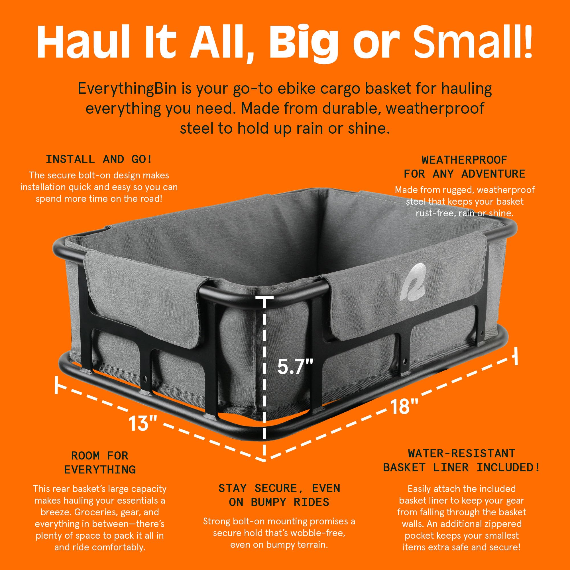 Retrospec EverythingBin Heavy-Duty Steel eBike Rear Basket with Water-Resistant Liner - Large Capacity Cargo Carrier for Electric Bikes (13x18x5.7)