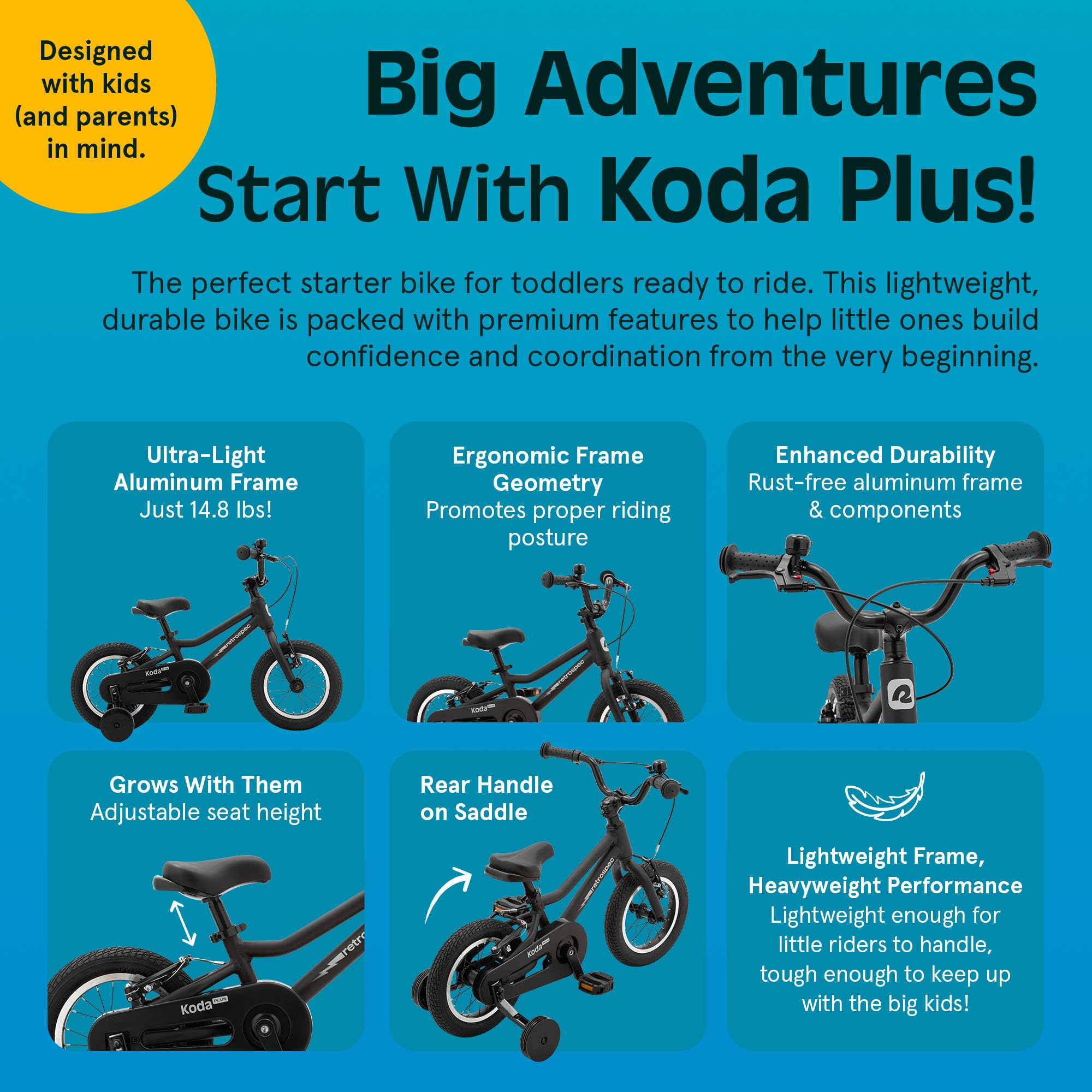 Retrospec Koda Plus Kids Bike for Boys & Girls Ages 2-3 Years - 12" Children's Bicycle, Adjustable Seat & Handlebars, Removable Training Wheels, Front Hand Brakes, Rear Coaster Brake & Safety Bell